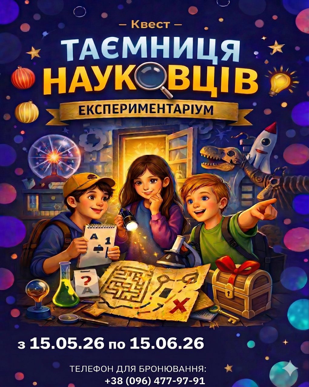 Квест “Таємниця науковців” у Експериментаріум — це захоплива пригода для школярів, де кожен стане справжнім дослідником! На вас чекають ребуси, хитрі запитання та таємні підказки, заховані серед наукових експонатів. Лише працюючи разом, ви зможете знайти правильний шлях і відшукати подарунки, які залишили загадкові науковці. Час обмежений, тож увімкніть логіку, кмітливість і вперед — до розгадки головної таємниці!